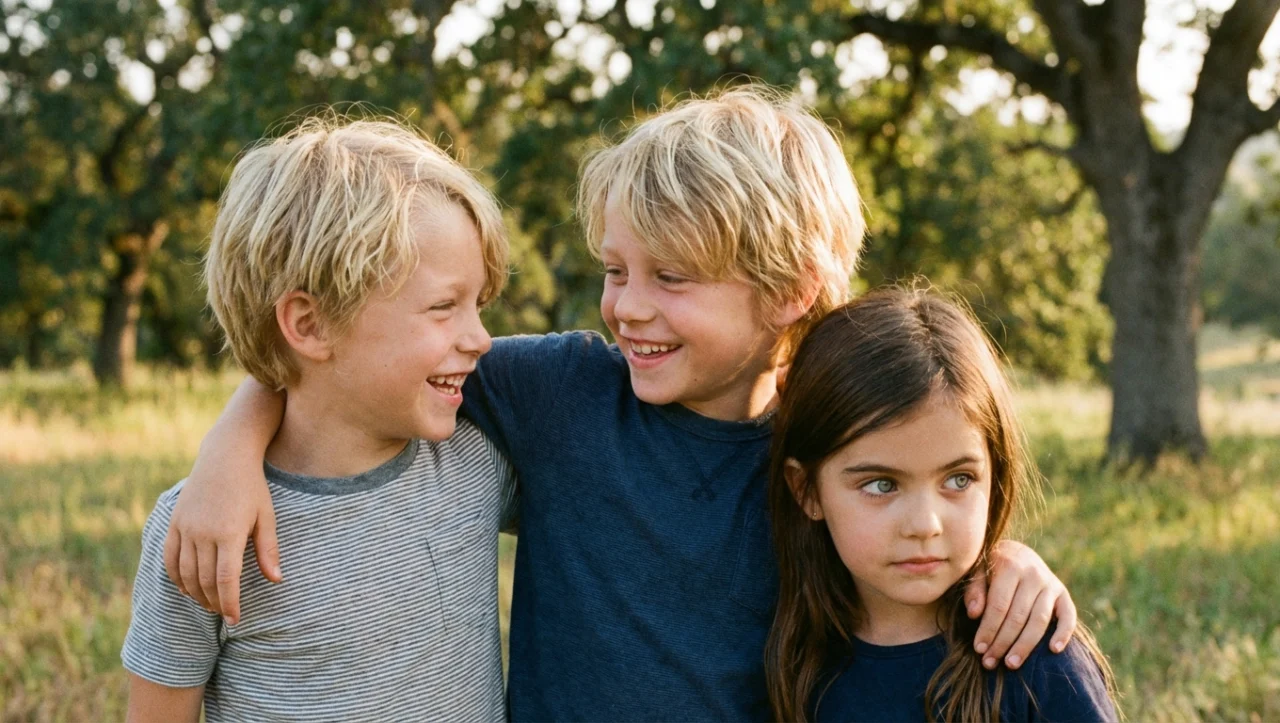 Fratrie d’enfants blonds : • Garçon blond : L’aîné, environ 14 ans • Fille blonde : La cadette, environ 11 ans • Vraie fratrie très bienvenue !